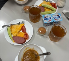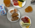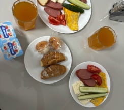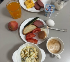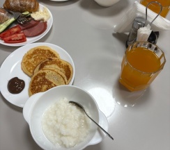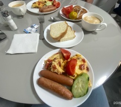 В столовой хороший выбор блюд для завтрака: различные каши, фрукты, овощи, кексы, конфеты, сок, чай, кофе, различные яичницы и запеканки, йогурты.