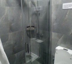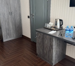 В номере гигиенические принадлежности, полотенца, халаты, чайные наборы, фен. В душевой комнате теплый пол и стена что позволяет высушить футболку/носки быстро.