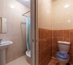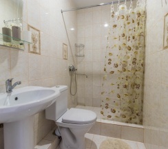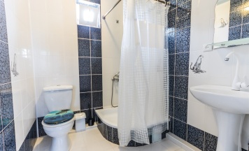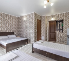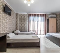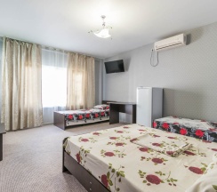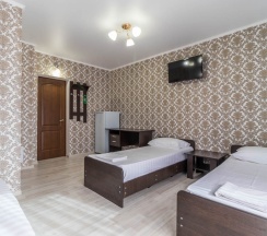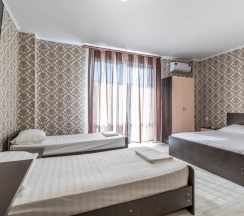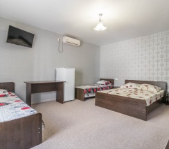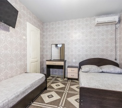 Двуспальная кровать, две односпальные кровати, шкаф, столик, зеркало, кондиционер, телевизор, чайник, холодильник. Уборка, смена полотенец и постельного белья 1 раз в 5 дней. Санузел в номере.