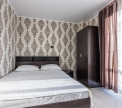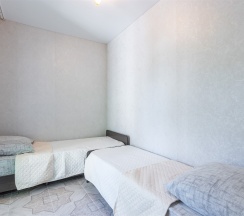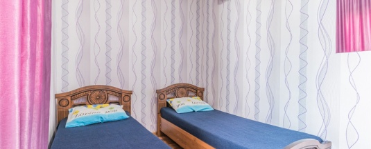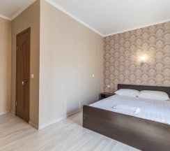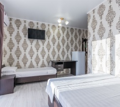 Двухкомнатный номер. Площадь: 25 кв.м. Две двуспальные кровати, тумбочки, зеркало, шкаф, светильник, чайник, кондиционер.Санузел в номере. Уборка, смена полотенец и постельного белья 1 раз в 5 дней.
