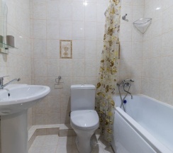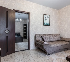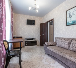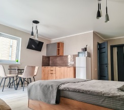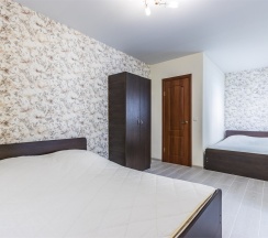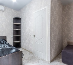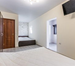 В номере: Двуспальная кровать, две односпальные кровати, кухонная зона с варочной поверхность, микроволновой печью, чайником с мелкой посудой, зеркало, шкаф, тумбы, телевизор, кондиционер, холодильник, стиральная машина, совмещенный душ, туалет. Уборка, смена полотенец и постельного белья 1 раз в 5 дней.