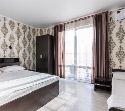 Двуспальная кровать, две односпальные кровати, шкаф, столик, зеркало, кондиционер, телевизор, чайник, холодильник. Уборка, смена полотенец и постельного белья 1 раз в 5 дней. Стенка-гардероб при входе. Балкон.Санузел в номере.