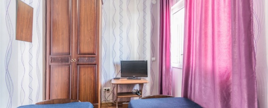 Две двуспальные кровати, шкаф, столик, зеркало, кондиционер, телевизор, чайник, холодильник. Стенка-гардероб при входе. Санузел в номере. Уборка, смена полотенец и постельного белья 1 раз в 5 дней.