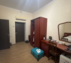 Отличный отель, есть лифт, чистые просторные номера , стандарт с балконом, есть сушилка , маленький холодильник и вообще все необходимое, мыло шампунь набор на один день , чайник , стаканы, удобный шкаф, фен, кондиционер, номер не маленький, вид из окон в город, но есть номера с видом на море, у них другая цена и они на уровень лучше , и они уже считаются не стандарт , а улучшенный или люкс, но и стандарт хороший номер, не очень шумно, хотя рядом дорога, но она не трасса, а обычная не сильно проезжая