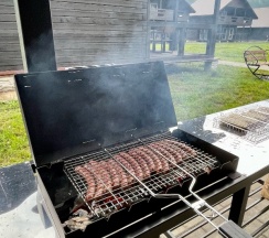 На террасе каждого домика есть стол и стулья. На территории подозреваемый бассейн, отдельная общая кухня, гриль-зона, баня, детская площадка.