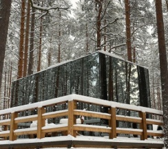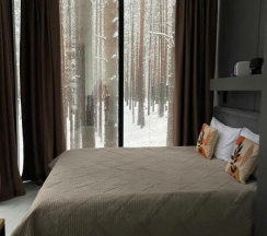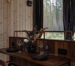 Необычная конструкция дома с панорамным остеклением в пол подарит незабываемые ощущения и слияние с природой. Вы насладитесь видом на сказочный лес и мистическое озеро. Стильный дизайн, удобная большая кровать для крепкого сна. Собственный санузел оснащен раковиной, душевой кабиной, феном.
