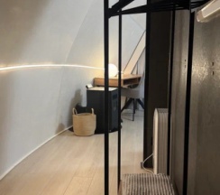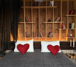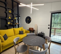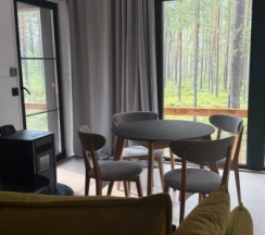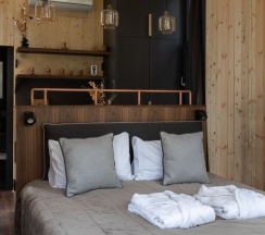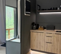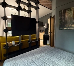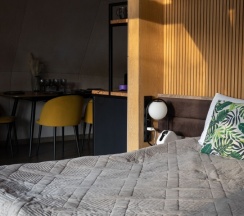 Все для вашего удобства: В вашем распоряжении собственный санузел с душевой кабиной и феном, уютный кухонный уголок с чайной станцией, мини-холодильником и необходимой посудой. Атмосферный пеллетный камин согреет вас прохладными вечерами, а кондиционер подарит приятную прохладу в жаркие дни. Два дополнительных спальных места на мезанине сделают ваше пребывание еще более комфортным.