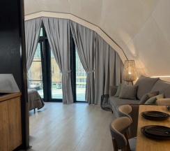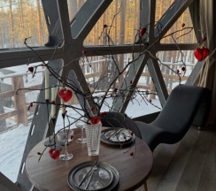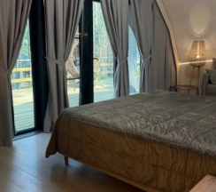 Невероятная конструкция дома в виде полусферы, уютная отделка стен деревом, которое позволяет дышать полной грудью. Панорамное окно с видом на сказочный лес и мистическое озеро. Стильный дизайн, удобная большая кровать для крепкого сна. Собственный санузел оснащен раковиной, душевой кабиной, феном.