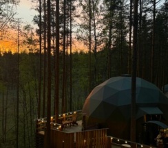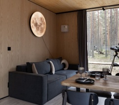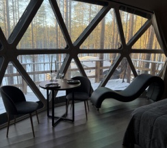 Уют и комфорт: Невероятная полусферическая конструкция, уютная деревянная отделка, наполняющая пространство ароматом леса, и панорамное окно, открывающее захватывающий вид на сказочный лес и таинственное озеро. Просторная кровать обеспечит вам крепкий и спокойный сон. Стильный дизайн и продуманная планировка подарят ощущение умиротворения и комфорта.