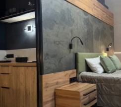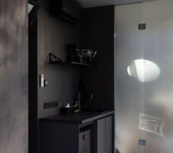 Кухонный уголок оснащен чайной станцией, мини-плитой, раковиной, мини-холодильником, набором необходимой посуды.
