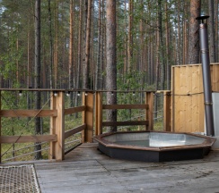 Купель - это тепло и уют в любое время года. Вы насладитесь видом на лес и озеро, расслабляясь в горячей воде на свежем воздухе. Стоимость одной протопки купели уже включена в стоимость проживания.
