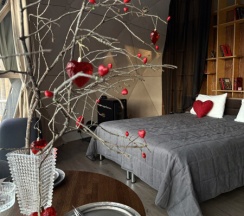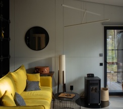 В каждом лодже есть атмосферный пеллетный камин, кондиционер, мягкие стулья у обеденного столика, раскладной двуспальный диван и два дополнительных спальных места на импровизированном втором этаже (мезанине).