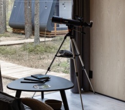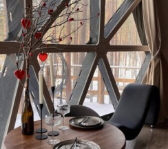 В каждой сфере есть атмосферный пеллетный камин, кондиционер, мягкие стулья у обеденного столика, два дополнительных спальных места на импровизированном втором этаже (мезанине).