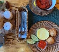 Завтрак включен в стоимость проживания - на выбор омлет/каша овсяная на коровьем молоке/рисовая на кокосовом молоке и мини шведский стол с сыром, колбаска/ветчина, овощи, зелень, творог, варенье.