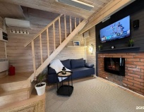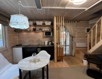 Первый этаж это кухня-гостинная, где установлен раскладной обеденный стол, есть два небольших диванчика. Имеется ТВ, блютусприемник. На кухне - тостер, электрический чайник, свч, индукционная плитка. Отдельное спасибо за кофемашину, кофе очень вкусный :)