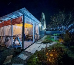 Мы снимали домик в марте и хоть зелени было немного, но все равно было уютно от подсветки из гирлянды на доме и деревьях.