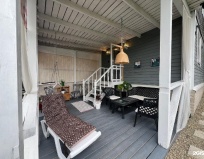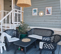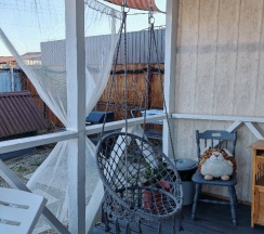 Перед входом в дом - веранда со столиком, креслами, диванчиком, подвесная качель.