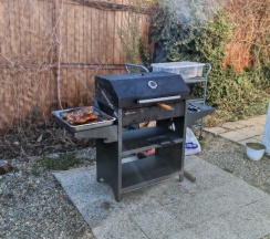 Рядом с домом мангальная зона. Есть все необходимое - лопатка, щипцы, решётка для приготовления мяса. Мангал можно закрыть, имеется датчик температуры, есть площадки для посуды и продуктов.
