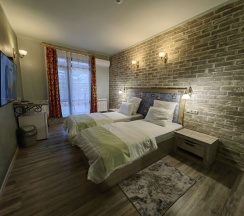 Просторный номер в стиле лофт. В номере имеется: сан. узел с туалетными принадлежностями, халаты, тапочки, полотенца, гладильные принадлежности, кондиционер, телевизор, мини-холодильник, сейф, wi-fi, веранда с видом на горы и лесную зону.