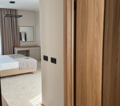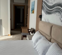 Стильный номер для отличного отдыха у моря, имеется все необходимое: современная новая мебель, двуспальная кровать (180×200), 2 шкафа для одежды, сейф, фен, телевизор, холодильник, необходимая посуда, сплит-система, обеденный стол.