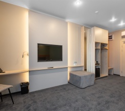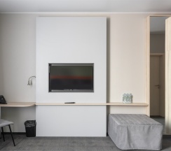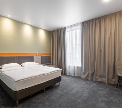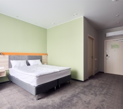 Номер площадью 18 м2 с 1 двуспальной кроватью с анатомическим матрасом рассчитан на 2 взрослых и 1 ребенка.