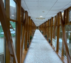Отдыхали 4 ночи в феврале 2025. Жили в корпусе А. Очень красивый холл из натурального камня, стоят живые цветы. бронировала заранее, заселили быстро. Лифты быстрые, никогда не было очереди или долгого ожидания. Очень удобно, на цокольном этаже был прокат снаряжения по бюджетным ценам и бесплатные шкафчики для хранения.