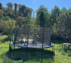Есть кинотеатр под открытым небом, он же - танцпол или что придумается, большой очаг с креслами, которые не хочется покидать, баня у реки (!) в которой позже углубят купель (сейчас тоже можно окунуться, но мелковато), есть гамаки и батут и теннисный стол. В целом территория очень большая и грамотно зонирована: тем, кто хочет поспать в тишине - ничто мешать не будет. А утром здорово попить кофе у журчащей реки в прохладе, сидя в креслах-мешках. В общем, все сделано с душой и старанием, чтобы перезагрузиться, обновиться и почувствовать себя немного счастливее.