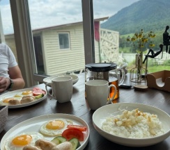 Если кратко: чистота 10 баллов, приятное хлопковое постельное белье, удобный матрас, вид из окна - 100 из 10, шторы блэкаут. А теперь более развернуто для тех, кто интересуется этой гостиницей. Первое, на что обращаешь внимание - терраса с потрясным видом. Когда заходишь в номер погружаешься в атмосферу уюта и полной чистоты. Серьезно, номер выглядит, словно в нем еще никто до нас не жил. В ванне на душевой кабине нет разводов, пыль везде протерта, запах чистоты и ничего лишнего. Необычной чертой является то, что на столе при заселении вас ждут карандаши, краски и холст. Я увезла отсюда несколько написанных мною картин, а еще пару малышек подарила хозяину в благодарность за теплый приём. Это, кстати, отдельный пункт. Дмитрий невероятный человек, создает волшебную атмосферу. К нему приезжаешь, словно к старому другу, которого давно не видел, а ему всегда есть что рассказать. В номере есть маленькая кофе-машина, чайник, травяной чай, холодильник. Так что всегда можно будет попить чайку с пироженкой, которую привезете с собой. Однако я очень рекомендую посетить местный ресторан. Здесь не только восхитительные и сытные завтраки, но и основное меню идеальное. Все, что мы ели заставило нас закрывать глаза от удовольствия. Еще в номере есть пауэр банк, который вы можете взять с собой, если отправились на экскурсию. В номере нет телевизора, но он и не нужен. Потому что заняться есть чем. Полистать книгу с красивыми видами, поиграть на ханге, порисовать, просто посмотреть в окно! За две ночи что мы здесь пробыли мы отдохнули так, будто провели по меньше мере неделю. Еще из деталей - машину свою вы можете оставить на территории и не переживать за нее. Вам дают пульт от ворот и вы сам себе хозяин - когда хотите, тогда и уезжаете/приезжаете. Водонагреватель в номере большой, хватит и длинные волосы помыть девушкам и помыться полностью двум людям. 2гис не дает мне написать больше слов, поэтому я просто желаю и дальнейшего процветания месту!