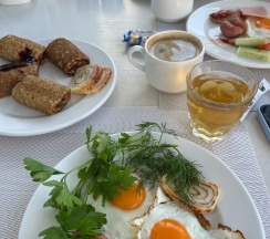 Если подробно, то ехали наабум. Предоплату не попросили, это немного насторожило. Зато когда приехали нашему восторгу не было предела. Во первых первое впечатление было великолепным, милая девушка Наталья на ресепшене зарегистрировала нас и проводила на бар, где нас угостила приветственными коктейлями не менее милая бармен. Дальше-больше, территория просто шикарная, зеленая, красивая, ухоженная. Далее номер, удобный, комфортный, чистый, стильный с видом на бассейн. Даже предложили поставить детскую кровать (ребенок 7 месяцев). Пришли мы к бассейну, а там такая красота😍. Бассейн стоит на солнце, вокруг него шезлонги с зонтиками, детская чаша. Не знаю на сколько он «подогреваемый», но за счет того что он не в тени, вода была теплая, даже за ночь не успела остыть. Купались до вечера. Вышли на завтрак, довольно разнообразный шведский стол (каши, вареники, блины, колбасно-сырная нарезка, овощи, фрукты, сладости, яичница и омлет, сок, чай, кофе, различные соусы и джемы) и вкусный😋