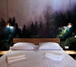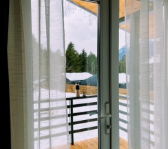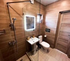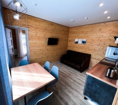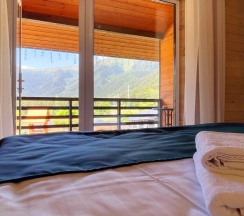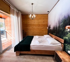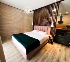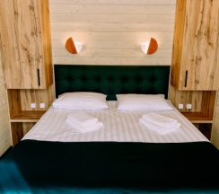 Дизайнерский номер, категории Люкс, расположен в корпусе "Панорама". В номере 2 комнаты, для комфортного проживания 2-4-х человек. В спальной комнате располагается большая двуспальная кровать, в кухне-гостиной раскладной диван на двоих. Панорамное остекление из спальни данного номера, открывает незабываемый вид на Кавказские горы, которыми можно насладиться лежа в теплой постели. Номер оснащен полноценной кухонной зоной и всем необходимым для приготовления пищи инвентарем. В номере есть Smart TV и бесплатный Wi-Fi. В санузле- душ, раковина, унитаз, полотенцесушитель и средства личной гигиены. В номере своя мебелированная терраса с видом на горы.