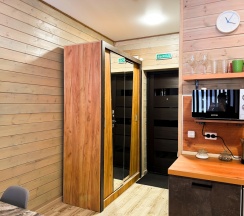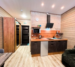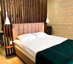 Дизайнерский номер, категории Студия, расположен в корпусе "Панорама". В номере 1 комната, для комфортного проживания семьи до 4-х человек. В комнате располагается большая двуспальная кровать и раскладной диван на двоих. Панорамное остекление из данного номера, открывает незабываемый вид на Кавказские горы, которыми можно насладиться лежа в теплой постели. Номер оснащен полноценной кухонной зоной и всем необходимым для приготовления пищи инвентарем. В номере есть Smart TV и бесплатный Wi-Fi. В санузле- душ, раковина, унитаз, полотенцесушитель и средства личной гигиены. В номере своя мебелированная терраса с потрясающим видом на горы.