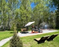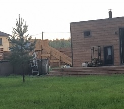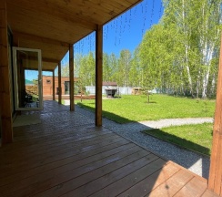 2. Территория — зелёный дворик с просторной террасой, мангалом, баней, чаном, детской площадкой, беседкой. Вечерами так приятно сидеть с чашкой чая!