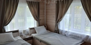 В доме шесть двухместных светлых комнаты, которые оформлены в загородном стиле и обставлены деревянной мебелью. И одна студия для семейного отдыха.