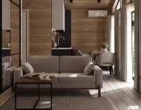 Внутри есть все необходимое для проживания: тёплые полы, стиральная и сушильная машины, плита, вытяжка и полностью оборудованная кухня для приготовления еды.