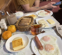 Отдельная тема - завтраки. Кормили на убой) так, что можно было и не обедать. Яичница с сосиской, каша, блинчики или сырники, хлеб, масло, сыр, варенье. Если завтрак не входит в стоимость номера, то комплексный стоит 300-350р, обед 550р. Можно выбрать еду по меню.