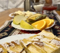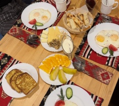 Завтраки сытные ( на выбор яичница или каша , орехи , масло, сыр ,фрукты, чай кофе , к завтраку дополнительно подается десерт ( гренки, пирог).