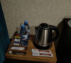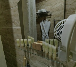 Дальше в номерах есть куча всяких кремов, это больше для девушек. Разные виды чаев, кофе, вода в бутылочках. Свежие халаты, полотенца.