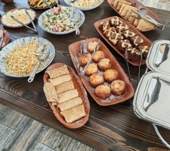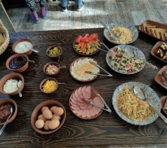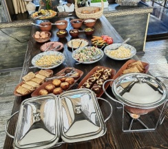 Завтраки здесь просто потрясающие! Они были сытными и разнообразными: каши, нарезки сырные, колбасные, овощные и фруктовые, сосиски жаренные, вареники с картошкой и творогом, салаты 3- х видов, гарниры: гречка, овощи, отварной картофель и картофель фри. Выпечка здесь своя и очень вкусная: сырники, запеканка, блины, панкейки, кексики, тортики, рулеты, пышки. Компоты вкусные. По желанию можно было заказать яичницу и омлет, и повара каждый день радовали нас изумительно вкусной едой.