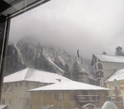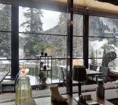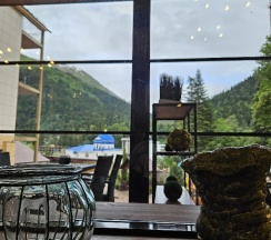 Отель хороший по отношению цена/качество. Ресторан лучший в поселке, проверено на собственном опыте. Хоть на первый взгляд дороговато, есть блюда на любой кошелек, приготовили вкусно и быстро. Вид из окна ресторана на канатную дорогу.