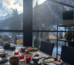Очень хорошие завтраки, большое разнообразие! В кафе шикарный вид на горы) и из номера тоже видно горы)