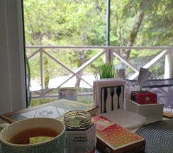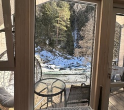 Отличный вид из окна домика на 1 линии от реки! Домик супер теплый, в домике теплые полы) касаемо инвентаря для проживания - все есть для комфортного отдыха) есть индивидуальные мангальные зоны, так же угощают баночкой варенья из шишек!)