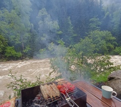 Мангальной зоной не пользовались, но все необходимое имеется и предоставляется. Парковка - участок с гравием, места вполне достаточно. Рядом трасса, но шум реки ее заглушает, до поселка совсем недалеко. Связь не ловит (для некоторых это даже плюс), но отлично работает wi-fi.