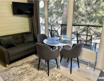 В домике есть все необходимое. На столе ждал приятный сюрприз в виде варения из шишек. Очень приятно! Везде чисто, красивый и стильный интерьер, есть вся нужная посуда! У каждого домика своя мангальная зона. Спали как младенцы под звуки природы. Очень довольны!