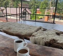 Светлана (хозяйка) встретила нас очень приветливо и гостеприимно несмотря на наш спонтанный и поздний приезд (около 23:00) . Дала возможность выбрать номер , поднялась с нами на второй этаж , а потом еще поднялась выше и показала площадку для отдыха . Кстати о ней : площадка для отдыха находится на 3 этаже миниотеля, там расположена печь-мангал , качелька с видом на горы и сосны и эко-лавочки, а также те самые всеми любимые лампочки желтого свечения .