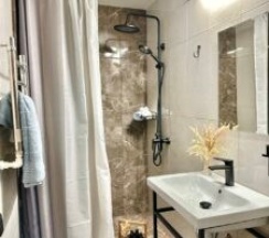 Ванная комната: душевая кабина, полотенца, туалетные принадлежности, средства гигиены, фен.