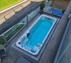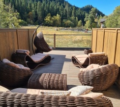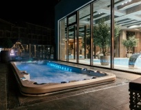 Спа-зона — отдельное удовольствие. Открывается потрясающий вид на горы, работает подогреваемое джакузи на открытом воздухе — незабываемые ощущения, особенно вечером. Для гостей предусмотрены стойки с прохладительными напитками — чаем и лимонадом, чтобы всегда можно было освежиться.