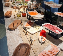 Питание на высоте: завтраки — шведский стол с широким выбором блюд, включая свежие морепродукты и красную икру. Обеды и ужины подаются по меню, с разнообразием на любой вкус. Порции щедрые, подача — изысканная, а главное — всё невероятно вкусно.