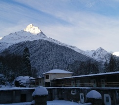 Да, в одноместном номере эконом класса советский интерьер, на троечку матрац, одна розетка, и вцелом, на первый взгляд, номер потёртый. Но! За 1000 рублей в день какие могут быть претензии?? Большой балкон на восток. Вид на горы, светит утреннее солнце, шумит горная река. Вода из под крана чистая. Как я понял, воду в Домбае берут из горных ручьев. Хоть в гостинице она и по расписанию, этого вполне хватает. Три часа утром, днём и вечером. Плюс она в промежутках не остывает совсем. Короче, не пугайтесь воды по расписанию. Вобще не напрягало. На первом этаже настольный теннис и столовая. Столовая, к слову, годная вполне. 350р завтрак, 400 обед. Порции огромные. Вернее - не лимитированные. Сколько попросил, столько и наложили. Аа, ещё лифты работают в здании. Есть стирка. Короче, достойное место.