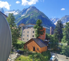 Отель находится в 5 минутах ходьбы от центра Домбая и канатной дороги. Стоит на берегу реки, из окон открывается удивительно красивый вид. Вокруг тишина, так как центральная дорога немного в стороне. Номера чистые, мебель хорошая и удобная. Можно заказать комплексный завтрак. Кормят вкусно и много. Как приятный бонус в течении всего дня кофе, чай и варенье в свободном (бесплатном) доступе для гостей отеля.