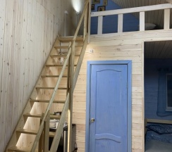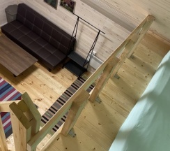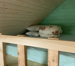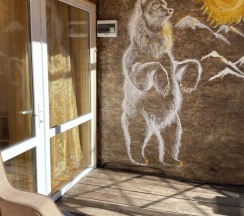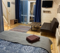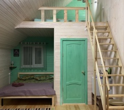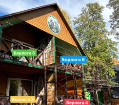 Номера категории СТАНДАРТ + (Берлога 5 или Берлога 6 ) Располагаются на 2 этаже двухэтажного дома. У номера отдельный вход, своя собственная веранда с диваном и столиком. Номера СТАНДАРТ + двухуровневые. В номере двухспальная кровать, двухспальное мансардное ложе, раскладной одноместный диван, телевизор, небольшой холодильник, электрочайник. Постельное белье и полотенца для лица предоставляются. Банные полотенца по запросу. Санузел: душ, туалет, горячая вода бойлер 100л. Отопление электрическое. Из номера открывается красивый вид на горы. На территории базы: беседки, мангальные зоны, общая кухня с посудой и мангальными принадлежностями, детская площадка. Баня за допплату.